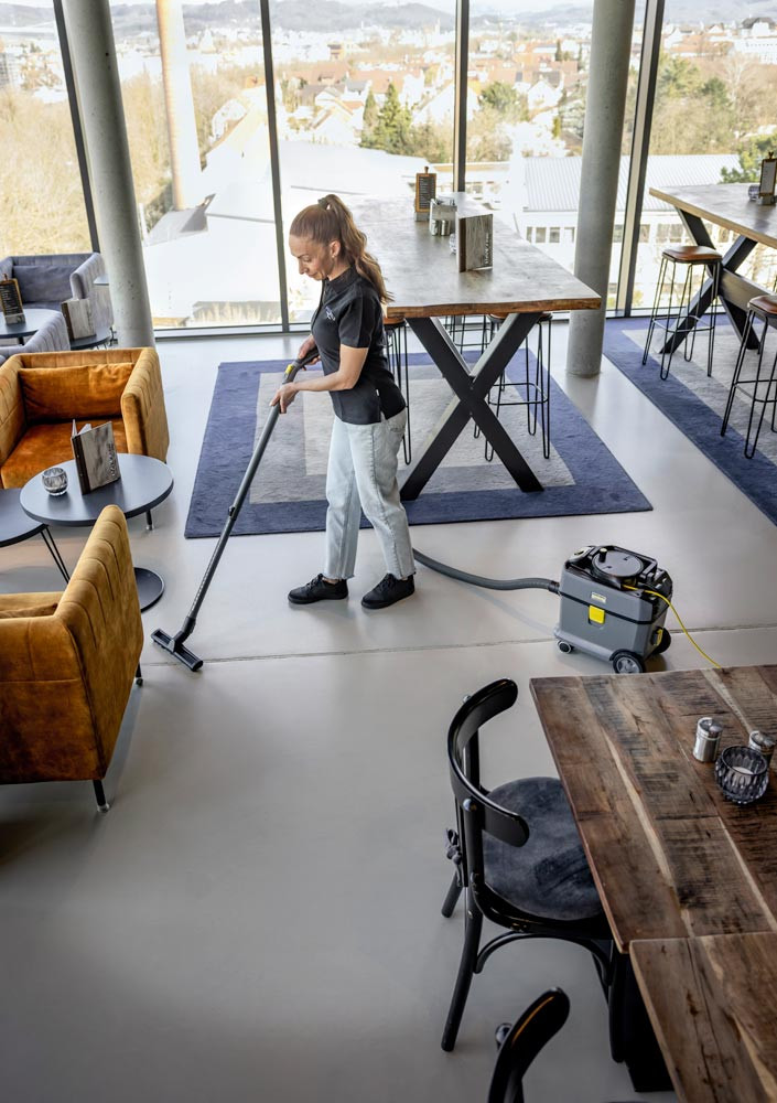 Tockensauger mit nachhaltigem und innovativem Design mit 45 % Rezyklatanteil ∙ Ultraleise: nahezu geräuschloses Arbeiten bei nur 52 dB(A) ∙ Müheloser, auch einhändiger Transport über Absätze und Treppenstufen ∙ Integrierte Zubehöraufbewahrung