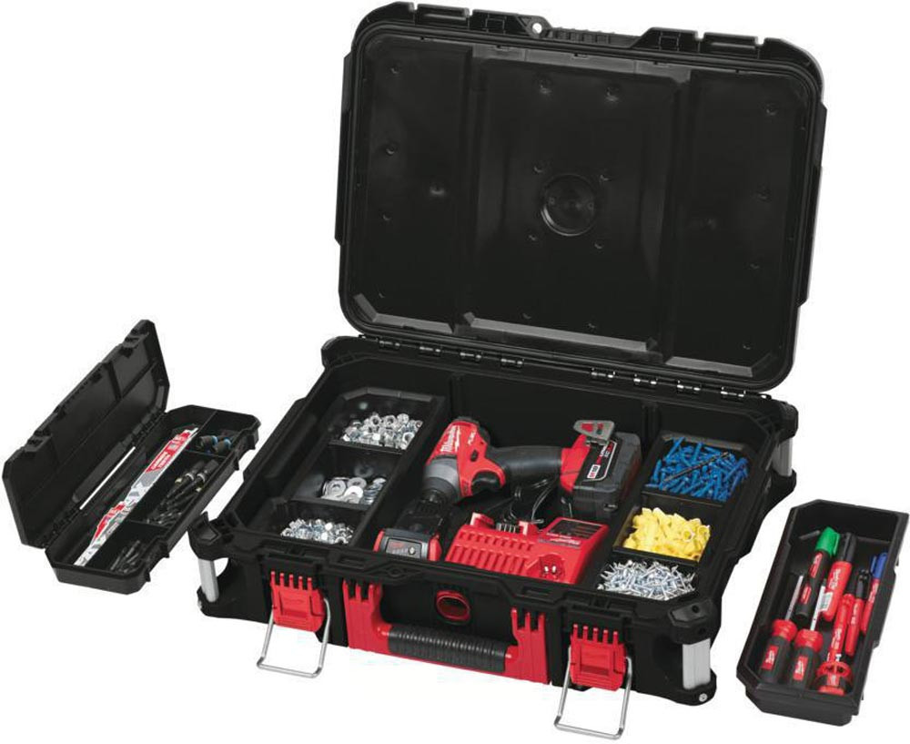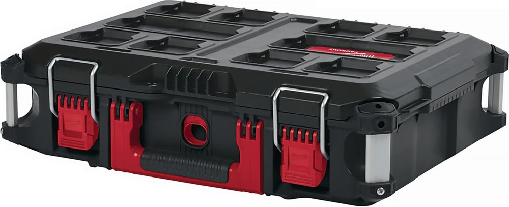 aus dem modularen Aufbewahrungssystem PACKOUT™ · Konstruktion mit stoßfesten Polymeren - ideal für den Baustelleneinsatz · IP65 Schutzklasse schützt vor Staub · Wasser und Schmutz · Metallstreben verstärken die Kofferecken · Verschlüsse mit Metallschließen · inklusive zusätzlicher Boxen zum übersichtlichen Verstauen von Kleinteilen · Einbaumöglichkeit für den ONE KEY™ TICK™ · zusätzlicher Metalltragegriff im Kofferdeckel zum leichteren Transport (nur beim großen Koffer)