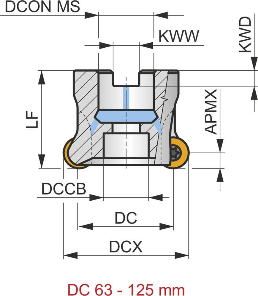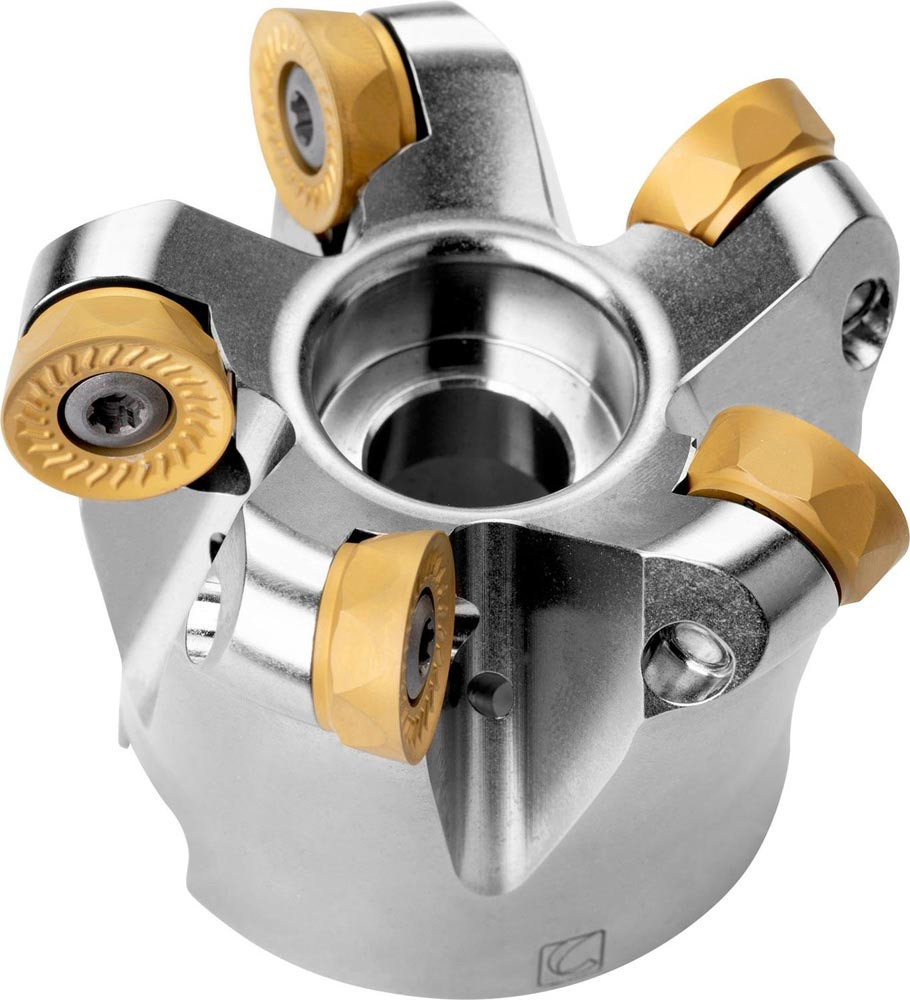 Kopier-Planfräser mit doppelt negativer Geometrie zum spannen von 6 Stück RCMT 1606MO.. einseitigen Wendeschneidplatten · Schnittdurchmesser 100mm mit 32mm Verbindungsbohrung gemäß DIN 8030-A · 50mm Überstandslänge · Kühlkanalbohrung zum Planfräsen · Kopierfräsen · Rampen · Helikalen Fräsen und progressiven Eintauchen mit einer maximalen Schnitttiefe von 8.0mm
