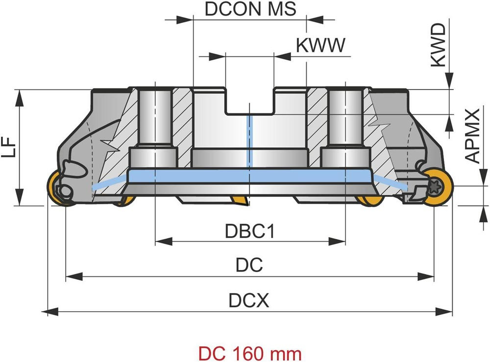 Kopier-Planfräser mit doppelt negativer Geometrie zum spannen von 8 Stück RCMT 1606MO.. einseitigen Wendeschneidplatten · Schnittdurchmesser 160mm mit 40mm Verbindungsbohrung gemäß DIN 8030-C · 63mm Überstandslänge · Kühlkanalbohrung zum Planfräsen · Kopierfräsen · Rampen · Helikalen Fräsen und progressiven Eintauchen mit einer maximalen Schnitttiefe von 8.0mm