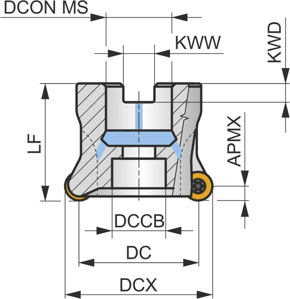 Kopier-Planfräser mit doppelt negativer Geometrie zum spannen von 4 Stück RCMT 1204MO.. einseitigen Wendeschneidplatten · Schnittdurchmesser 50mm mit 22mm Verbindungsbohrung gemäß DIN 8030-A · 40mm Überstandslänge · Kühlkanalbohrung zum Planfräsen · Kopierfräsen · Rampen · Helikalen Fräsen und progressiven Eintauchen mit einer maximalen Schnitttiefe von 6.0mm