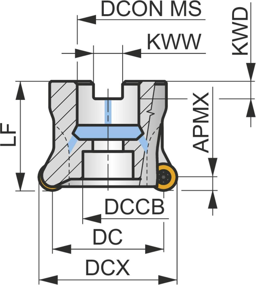 Kopier-Planfräser mit doppelt negativer Geometrie zum spannen von 5 Stück RCMT 10T3MO.. einseitigen Wendeschneidplatten · Schnittdurchmesser 50mm mit 22mm Verbindungsbohrung gemäß DIN 8030-A · 40mm Überstandslänge · Kühlkanalbohrung zum Planfräsen · Kopierfräsen · Rampen · Helikalen Fräsen und progressiven Eintauchen mit einer maximalen Schnitttiefe von 5.0mm
