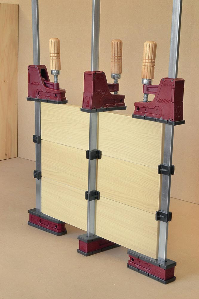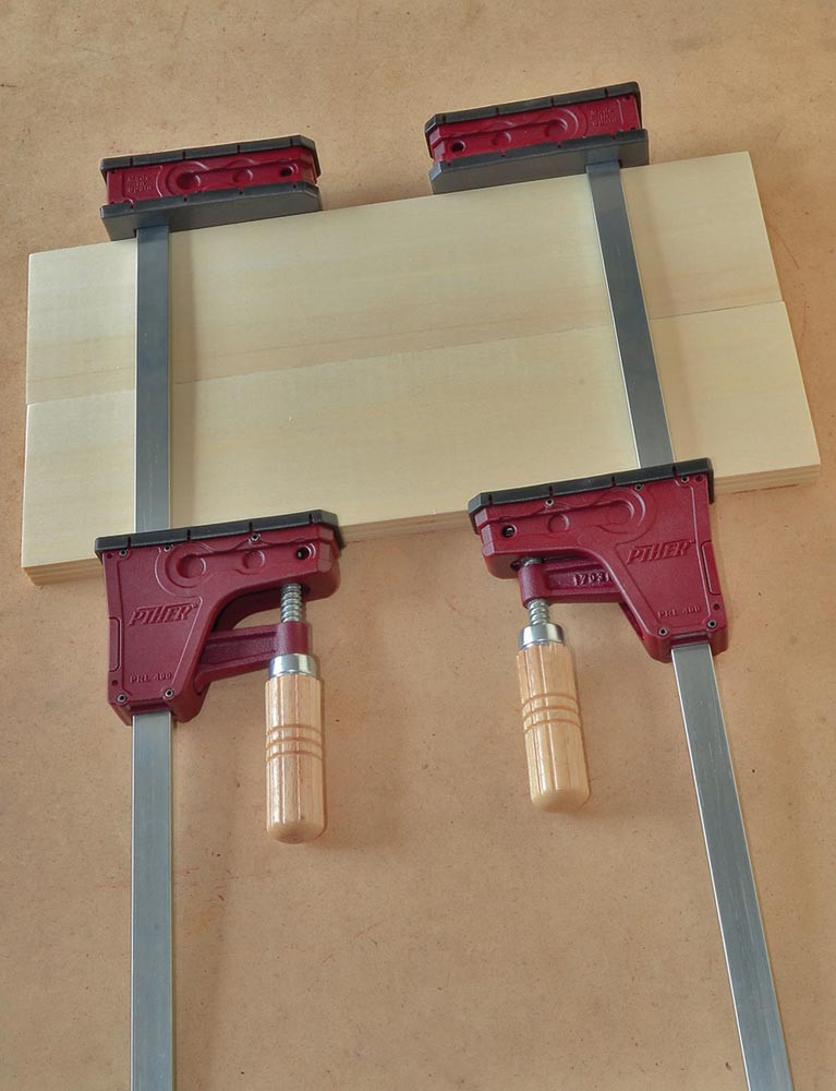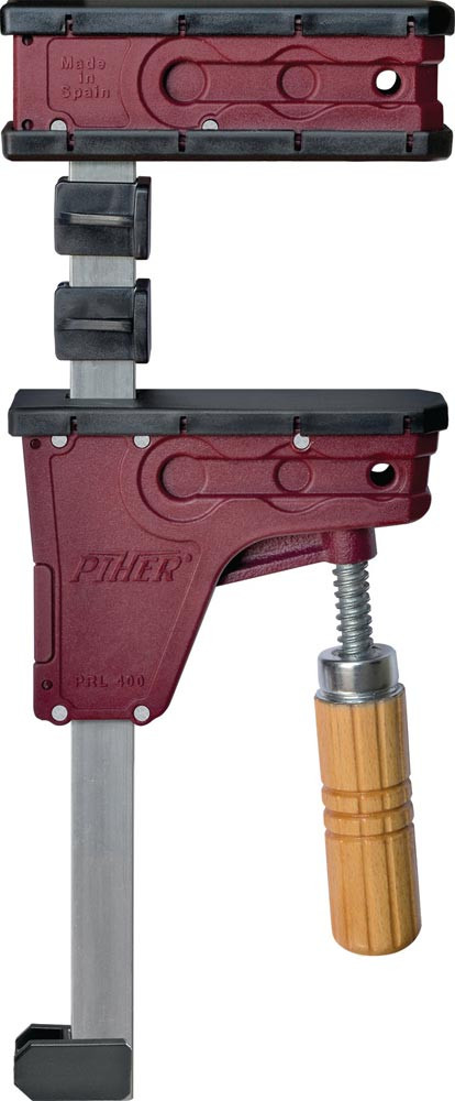 Parallelzwinge hält die Druckfläche jeder Spannbacke parallel · max. Spannkraft ca. 400 kg · Schiene 18 x 7 mm aus verzinktem Stahl · Kern aus Stahl, Ummantelung aus mit Fiberglas verstärktem Nylon · sieben Achsen aus Stahl · Griff aus Buchenholz · trapezförmige Spindel sorgt für einen schnellen Vorschub · Fallschutzbremse an der beweglichen Backe · austauschbare Schutzkappen, schützende Auflage auf der Schiene und Fuß zur Nivellierung · besonders geeignet für die Tischlerei und beim Heimwerken zum Kleben von Paneelen, Montage von Schubladen oder Rahmen · Optional erhätliche, schwenkbare Aufsätze Art. 6440783, um sowohl geneigte als auch parallele Flächen einspannen - so können eigene Aufsatzprofil wie Dreiecke oder Kurven verschraubt werden