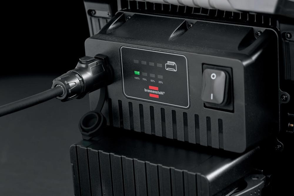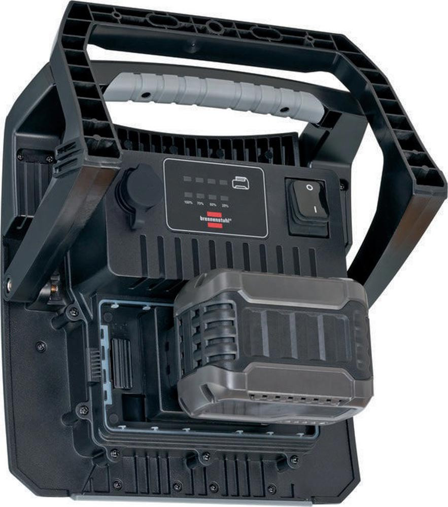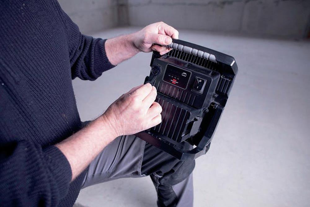 kompatibel mit 38 verschiedenen 18V Akkus (verschiedene Ah Klassen) der Powertool-Hersteller Bosch Professional, Makita, Dewalt, Milwaukee, Metabo CAS · mehr Flexibilität durch Hybridtechnik: Akku- und Netzbetrieb möglich, automatische Umschaltung von Netz auf Akku bei Stromausfall · Plug-In-Kabelanschluss · Schalter mit Funktion: 100% - 75% - 50% - 25% Licht · Leuchtdauer in Abhängigkeit des verwendeten Akkus, ca. 20 min / 1 Ah bei 100 % Lichtleistung · Akku-Zustandsanzeige · Akkus sind vor Tiefenentladung und Überhitzung geschützt · abnehmbare Akku Schutzhaube · LED Strahler mit Kippschutz, schützt Linse und Gehäuse des Strahlers · Gehäuse aus Aludruckguss · Gummierung zum Schutz des Gehäuses · ergonomischer Griff · Ein/Aus Schalter · Stativmontage möglich · Einsatz für den rauen Betrieb