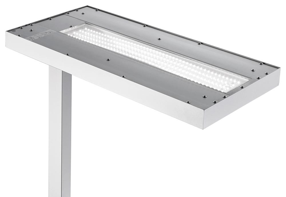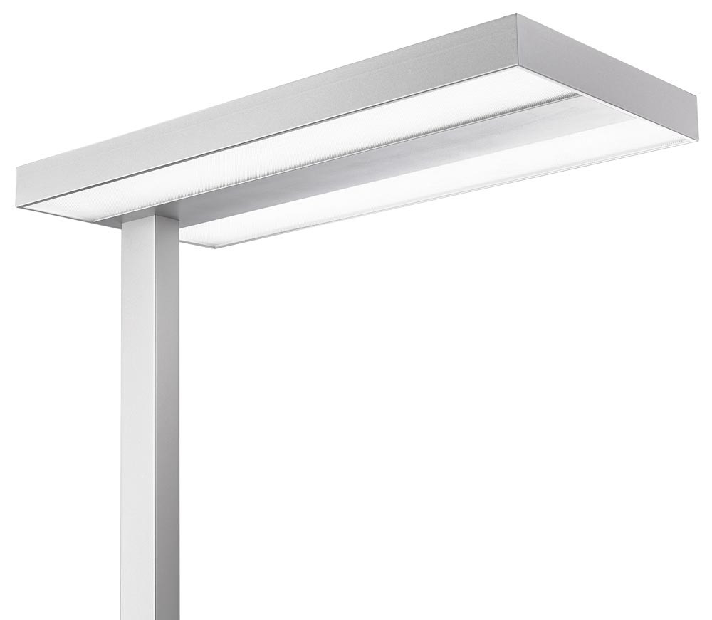 · Energieeffiziente Arbeitsplatzleuchte · Leuchtenkopf 280 x 610 mm · Abstahlung nach oben 60% und nach unten 40%, damit haben Sie direktes, blendfreies Licht für die Arbeitsfläche und indirektes Licht für die Raumbeleuchtung · Stufenlos dimmbar · Stabile Säule aus Aluminium · U-förmige Fußplatte aus massivem Stahl ermöglicht eine unauffällige Platzierung direkt am Schreibtisch · Gesamthöhe 1950 mm