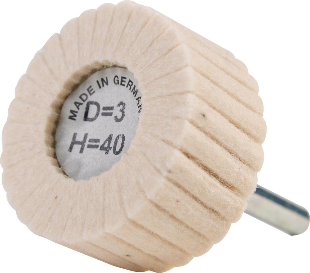 bestehend aus weichen Filzlamellen · für den Einsatz mit herkömmlicher Polierpaste zum Vorpolieren bis hin zum Hochglanzpolieren · geeignet für Stahl, Edelstahl (INOX), NE-Metallen, Glas, Kunststoff, Marmor und Stein · für schwer zugängliche Stellen und präzises Arbeiten · stets dieselbe Polierpaste mit einer Polierscheibe auf demselben Material einsetzen · für ein optimales Ergebnis, sollte mit einer Geschwindigkeit von 10m/s gearbeitet werden · Schaft-Ø 6 mm