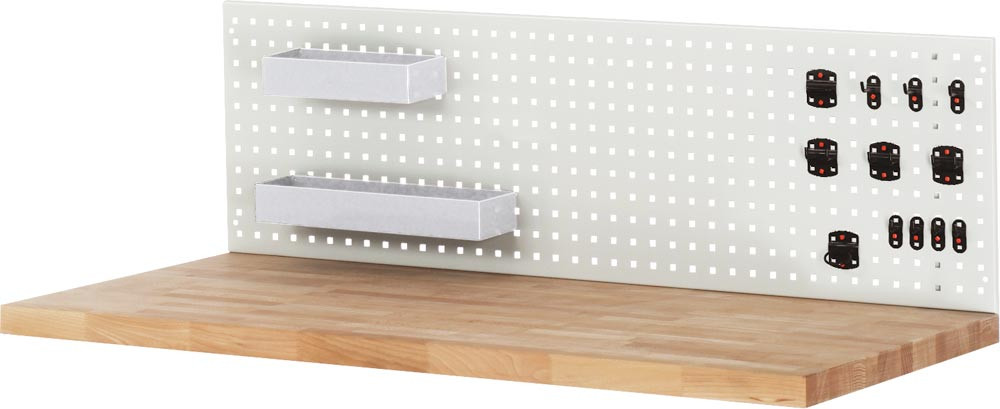 Lochplatte mit Halterungen, BxTxH 1500x15x450 mm, inkl. 12-teiliges Hakenset + 2 Ablagewannen, RAL 7035 E1893616