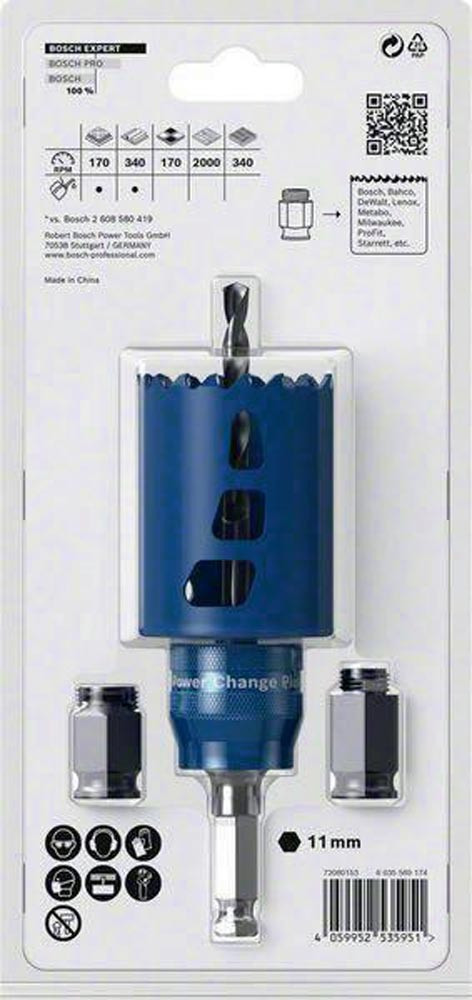 lange Lebensdauer beim Schneiden von Löchern in verschiedenen Materialen · mit Bosch Carbide Technology · perfekte Schnittform · ideal für schwere Aufgaben · einsatzbar in Holz, Metall, Edelstahl, Ziegelstein, weiche Fliesen und verstärkte Kunststoffe · zur Verwendung mit dem Power Change Plus-Schnellspann-Adapter