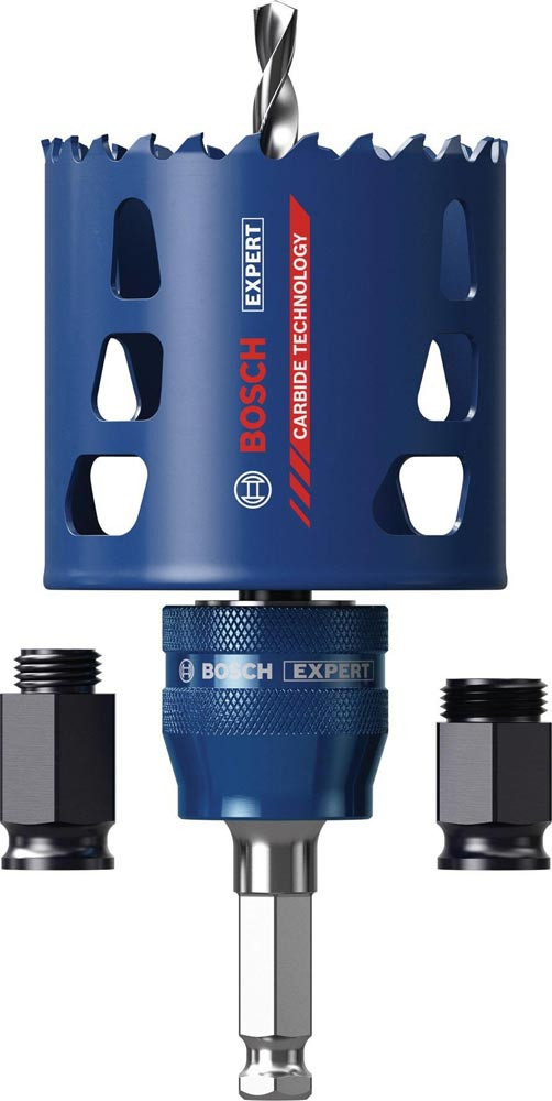 lange Lebensdauer beim Schneiden von Löchern in verschiedenen Materialen · mit Bosch Carbide Technology · perfekte Schnittform · ideal für schwere Aufgaben · einsatzbar in Holz, Metall, Edelstahl, Ziegelstein, weiche Fliesen und verstärkte Kunststoffe · zur Verwendung mit dem Power Change Plus-Schnellspann-Adapter