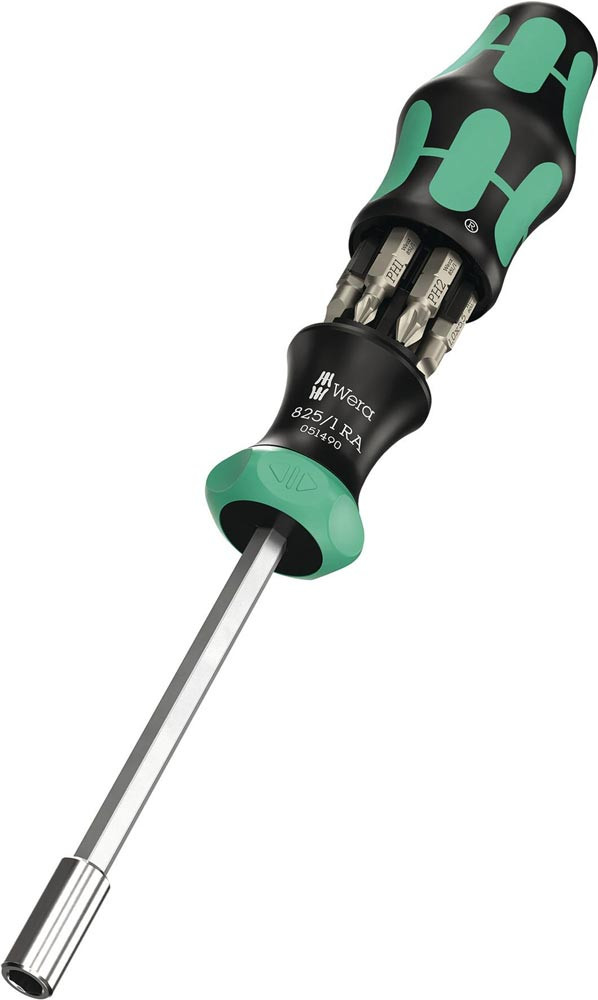 Kraftform Handhalter für 1/4″ Bits. Die im Griff integrierte Ratsche mit Feinverzahnung sorgt für schnelles Arbeiten. Das Umschalten der Schraubrichtung ist intuitiv: Wird der Ringschalter nach rechts gedreht · wird nach rechts geschraubt · wird der Ringschalter nach links gedreht · wird nach links geschraubt · für präzise Arbeiten kann die Ratschenmechanik mit der 0-Position deaktiviert werden · inklusive 6 zähharte Bits für den universellen Einsatz · untergebracht im Griff Integrierten Bit-Magazin · der starke Dauermagnet in der 1/4″ Bitaufnahme sorgt für sicheren Sitz des Bits · der 2-komponentige Kraftform Griff mit seiner Kombination aus Hart- und Weichzonen ermöglicht festes Zupacken und präzises Arbeiten
