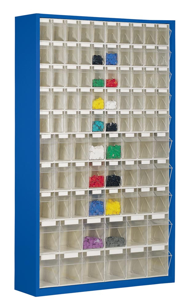 Magazinschrank, BxTxH 1270x250x2000 mm, 154 Kästen, 96xGr. 6, 50xGr. 5, 8xGr. 4, Gehäusefarbe RAL 5010 enzianblau E826146