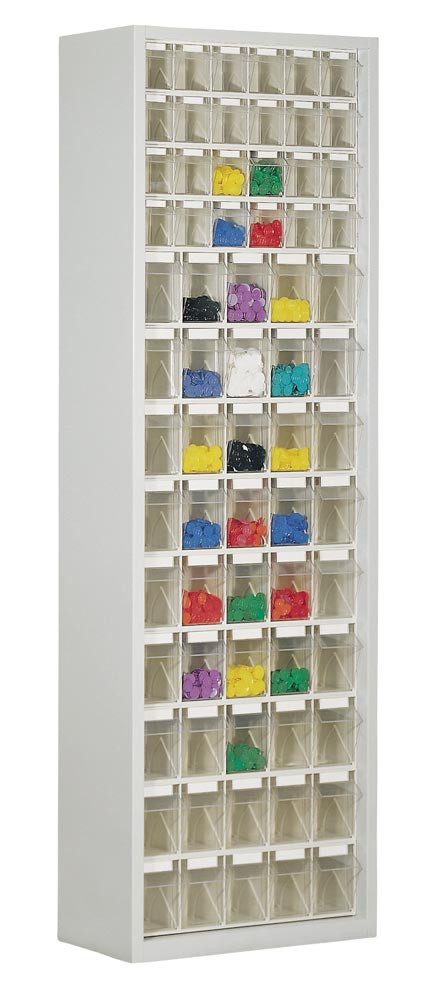 Magazinschrank, BxTxH 665x250x2000 mm, 69 Kästen, 24xGr. 6, 45xGr. 5, Gehäusefarbe RAL 7035 lichtgrau