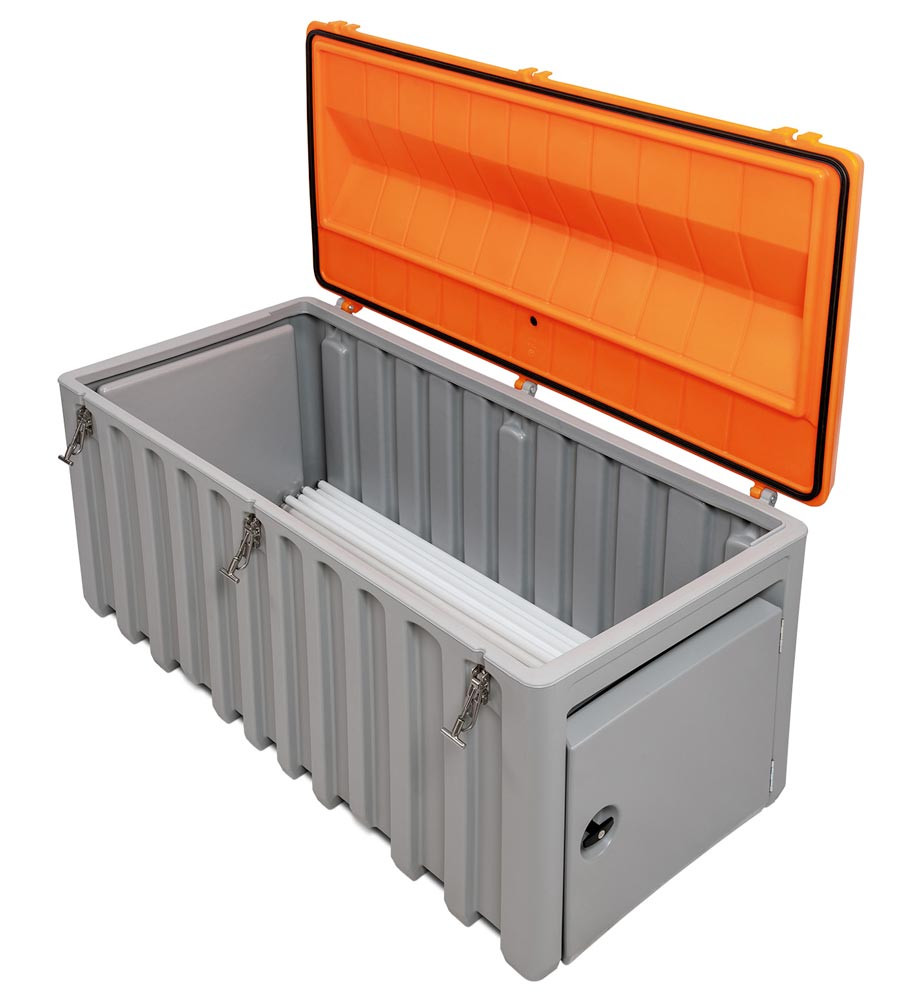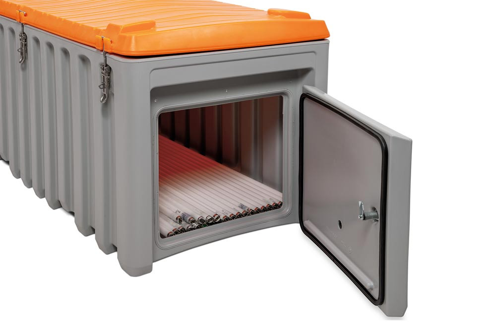 ∙ Behälter in grau/orange aus hochwertigem Polyethylen ∙ Wahlweise mit oder ohne Seitentür ∙ Tum Transport und Aufbewahren von Leuchtstoffröhren bis zu einer Länge von 155 cm ∙ Stapelbar, mit Arretierungsnocken ∙ Mit Staplertaschen und integrierten Handgriffen ∙ Deckelanschlag ∙ 3 Exzenterverschlüsse ∙ Durch eine umlaufende integrierte Dichtung absolut spritzwasserdicht