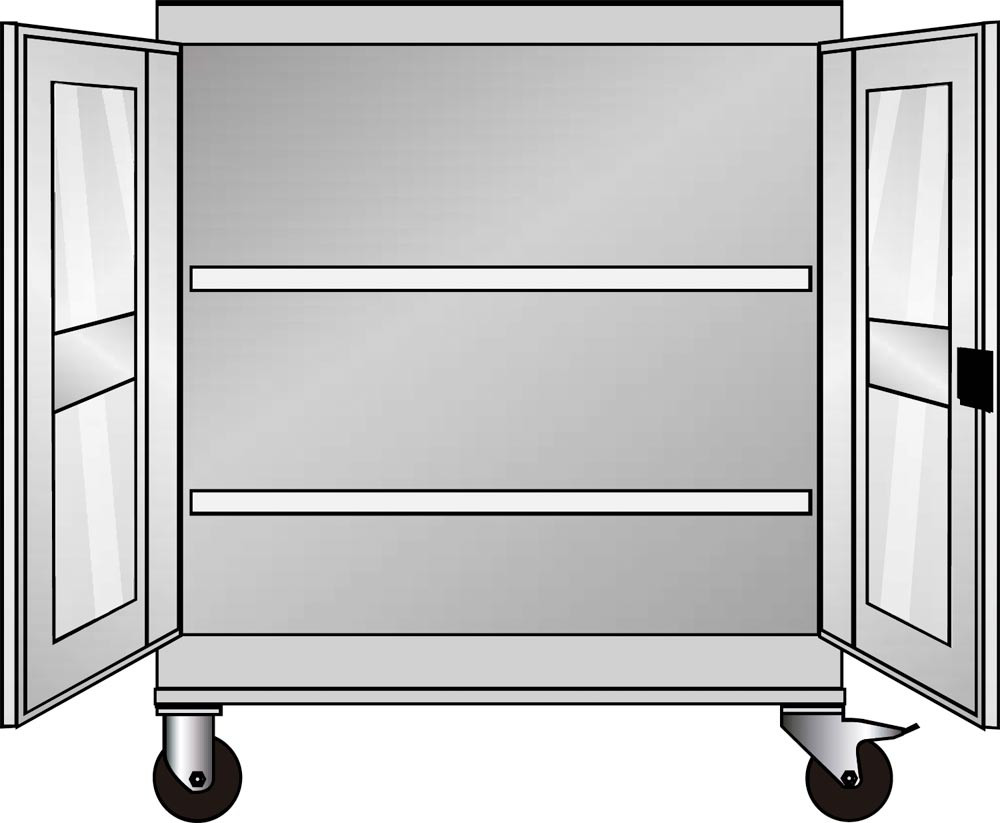 Mobiler Flügeltürenschrank mit Sichtfenstern, BxTxH 1005x500x1195 mm, 2 Fachböden, verzinkt, TL 100 kg, RAL 7035/5012