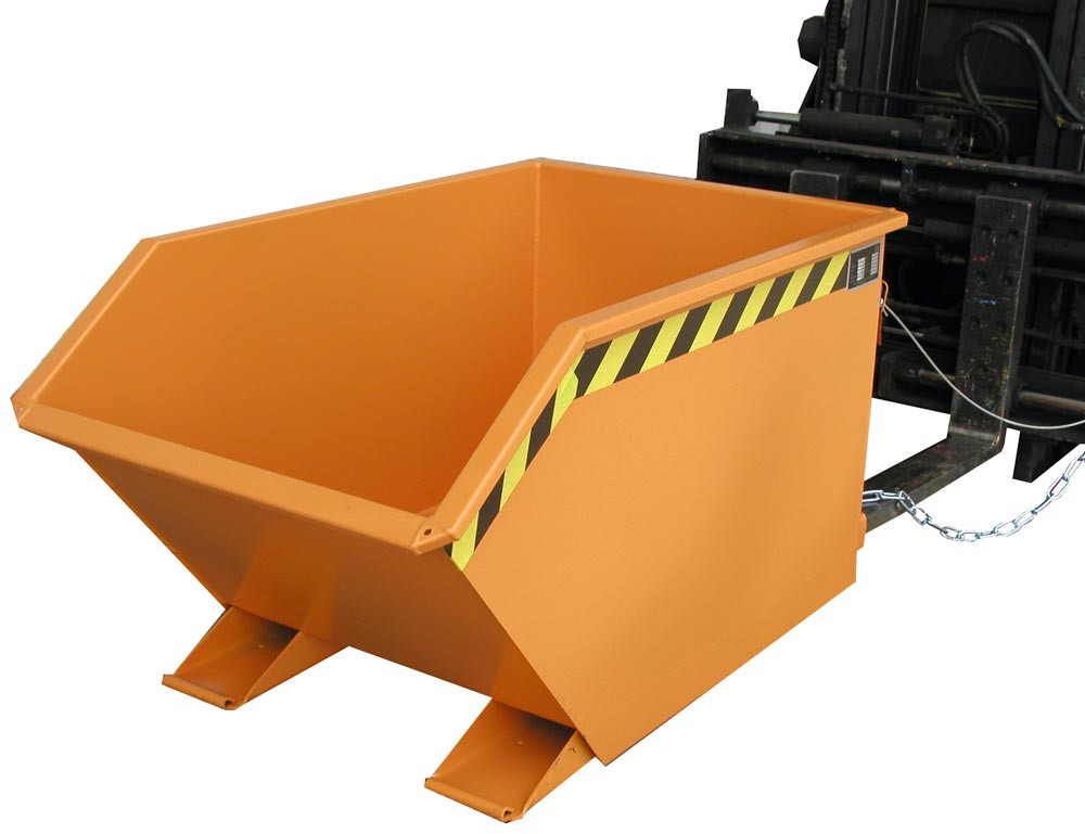 Mulden-Selbstkippbehälter, automatischer Aufrichter, Traglast 1000 kg, LxBxH 1440x780x680 mm, Vol. 0,50 cbm, RAL 2000 gelborange