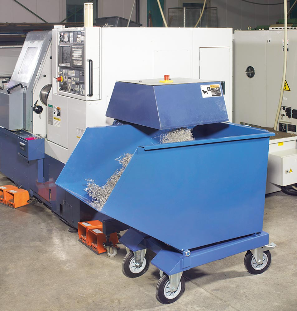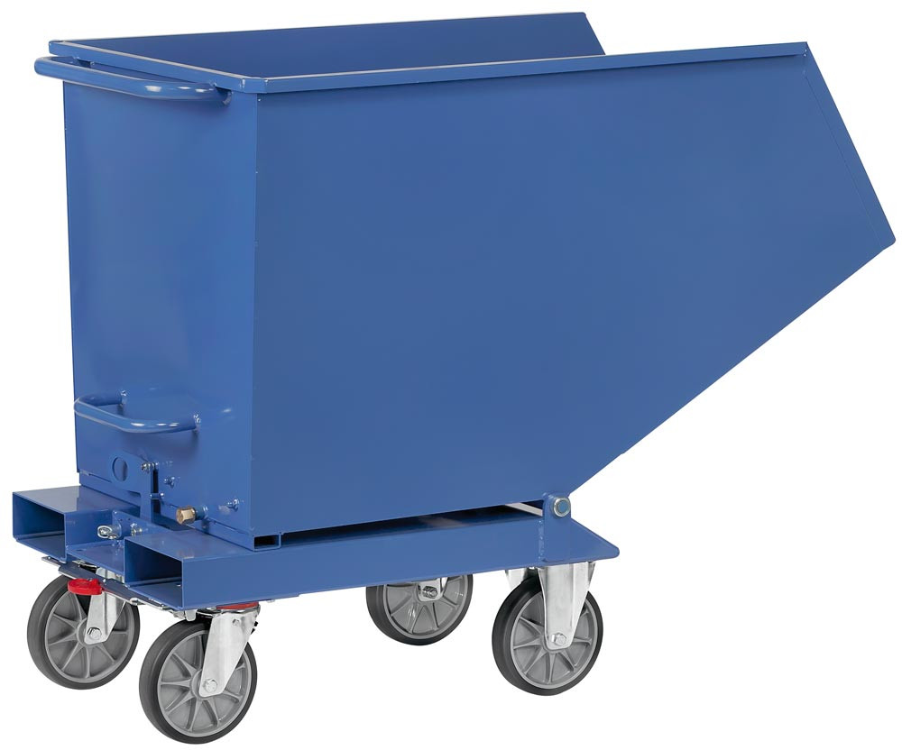 ∙ Pulverbeschichtet in RAL 5007 brillantblau, weitere Farben auf Anfrage ∙ Kippbar gelagerte Mulde aus 2 mm starkem Stahlblech, Schüttkante und Rahmen doppelt umgekantet ∙ Mulde öldicht verschweißt ∙ Untergestell aus 3 mm starkem Kantprofil mit integrierten Staplertaschen · Inkl. Trittblech, Kippsicherung und Rohrschiebegriff · Mit 2 Lenk- und 2 Bockrollen, Lenkrollen serienmäßig mit TOTALSTOP-Zentralbremssystem ausgestattet