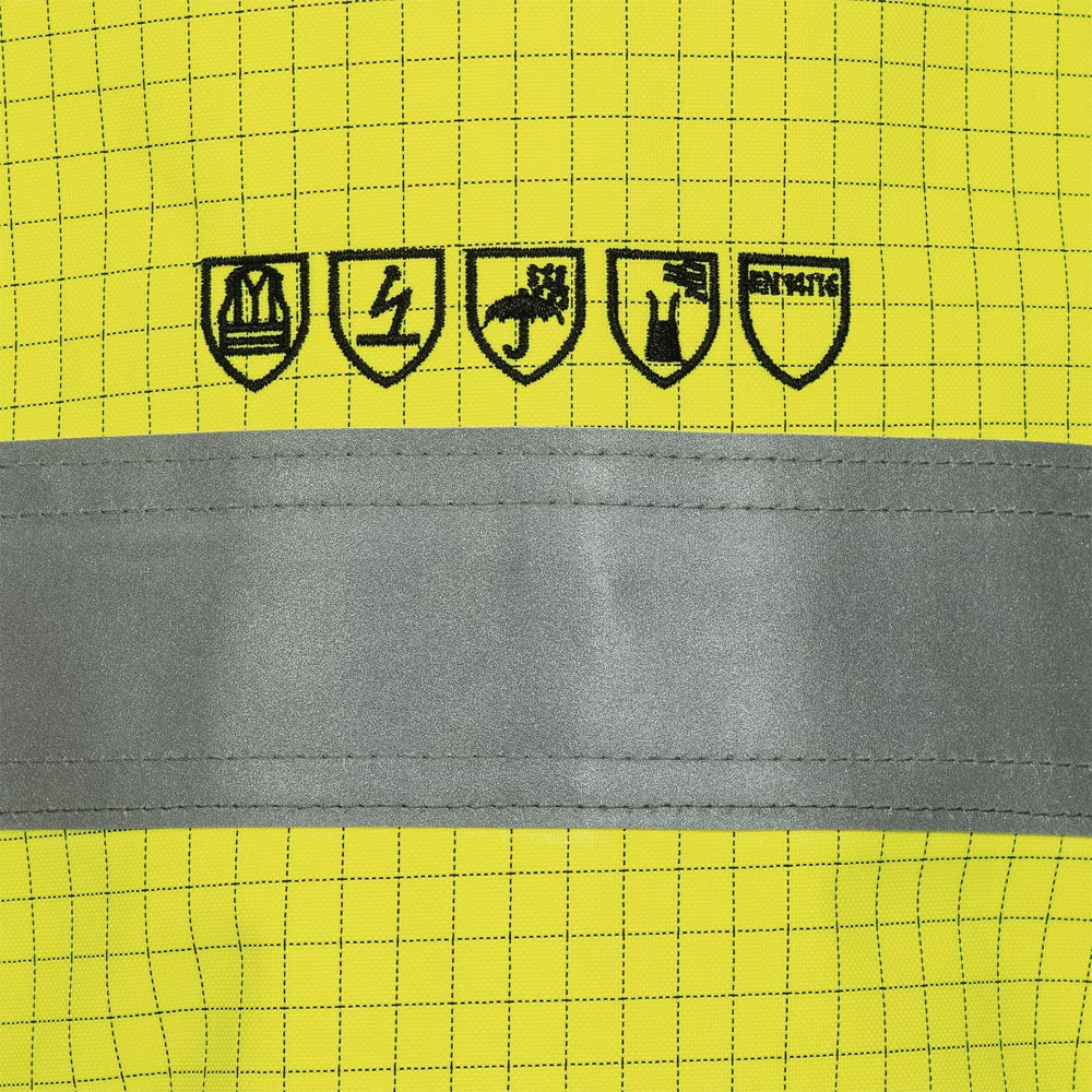 EN ISO 20471 Kl. 3 · EN 343 Kl. 3/1/X · EN ISO 14116 (Außenseite: Index 1, Innenseite: Index 3) · EN 1149-5 · EN 13034 Typ PB [6] · EN ISO 13688 · Obermaterial: 98% Polyester, 2% Karbon · Atmungsaktivität: 2000 g/m²/24 h · Wassersäule: 2000 mm · Wattierung: 100% Polyester · Futter: 100% Baumwolle · wind- und wasserdicht, atmungsaktiv · Nähte geschweißt · verdeckter robuster YKK® 2-Wege-Front-Reißverschluss mit Patte und Klettverschlüssen · verdeckte Reißverschlüsse garantieren Kratzfreiheit · weitenregulierbarer Ärmelbund mittels Klettverschluss und mit integriertem Strickbund · elastischer Saum · verstaubare abnehmbare gefütterte Kapuze verstellbar mit Kordeln · hoher Kragen mit Schutz gegen Witterung
