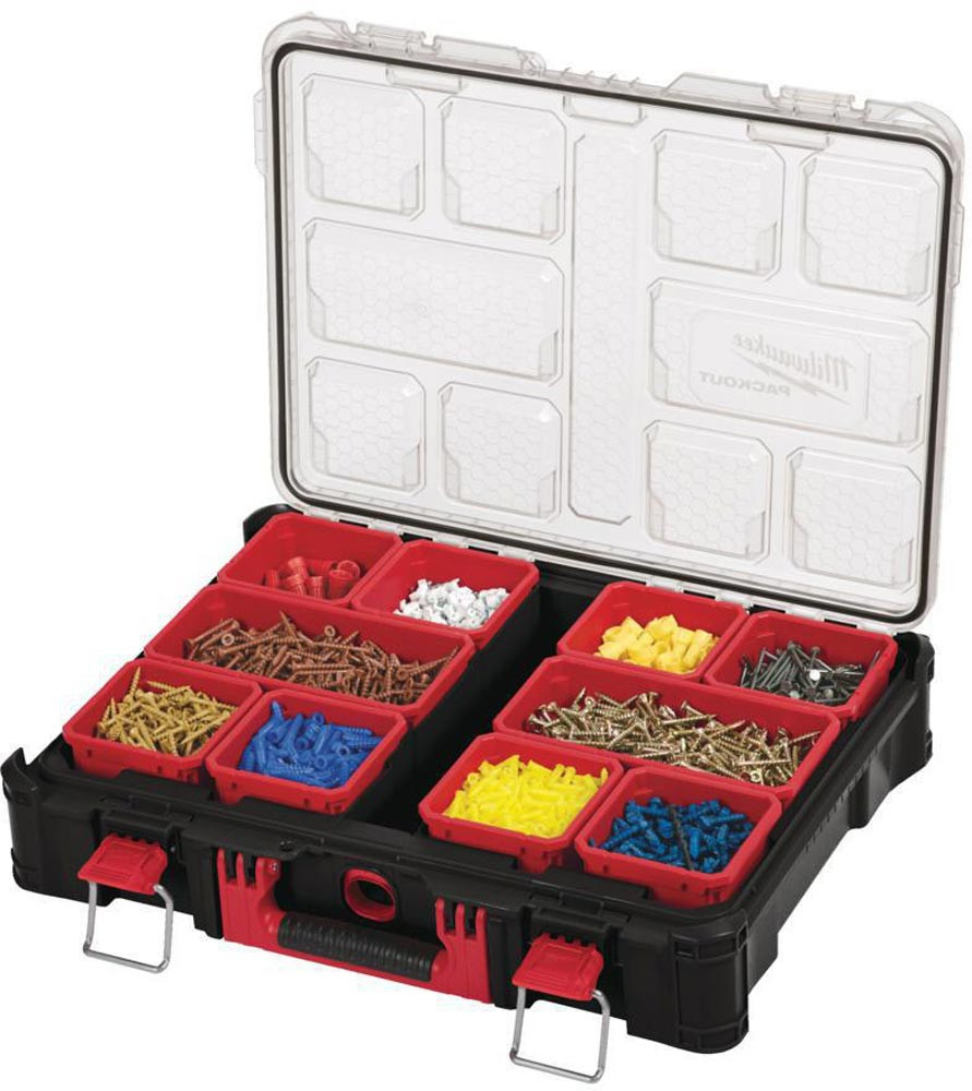 aus dem modularen Aufbewahrungssystem PACKOUT™ · Konstruktion mit stoßfesten Polymeren - ideal für den Baustelleneinsatz · stapelbare Boxen, ideal zur Sortierung von Kleinteilen und Zubehör · IP65 Schutzklasse schützt vor Staub, Wasser und Schmutz · transparenter Deckel sichert alle Sortierboxen im geschlossenen Zustand