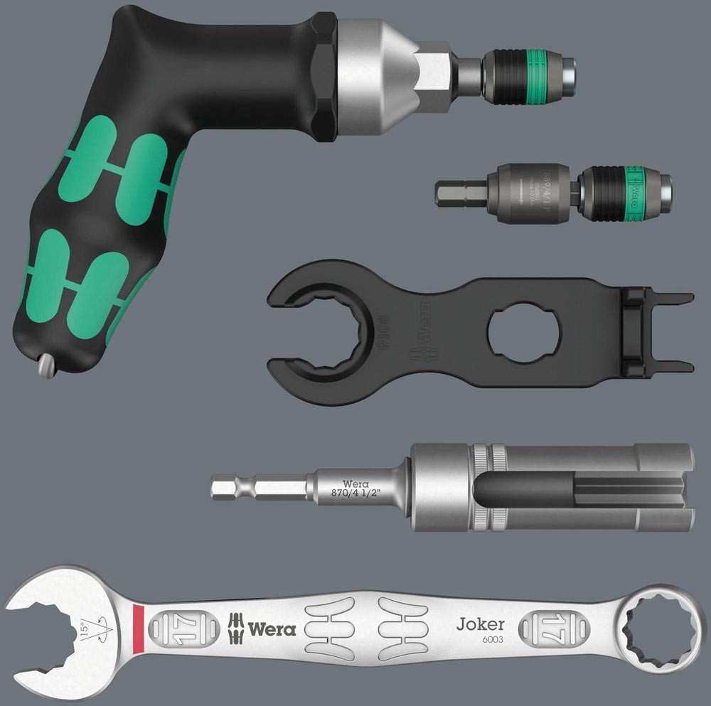 7-teiliges Werkzeug-Set für die Montage von Photovoltaik-Anlagen. 1 Drehmomentschraubendreher 7442 (Pistolengriff) für den Messbereich 3,0-6,0 Nm. Numerische Drehmomentwert-Anzeige. Verlässliches Überrutschen und akustisches Signal bei Erreichen des eingestellten Drehmoments. 1 Rapidaptor Bithalter 889/4/1 F mit Freilauffunktion für besonders schnelle Rückholbewegung ohne lästiges Absetzen beim Rechtsanzug. 1 Ringmaulschlüssel 6003 Joker. Durch die spezielle Maulgeometrie werden die Ansetzmöglichkeiten des Werkzeugs erweitert · damit ist der Ringmaulschlüssel besonders für enge Bauräume geeignet. 2 Montageschlüssel für Solar-Stecker MC4 (Multi-Contact). 1 Steckschlüsseleinsatz 1/2″ (geschlitzt) Gr. 17 für die Montage von Einbausteckverbindern · 1 Werkzeugschaft (Adapter 1/4″ auf 1/2″) für handbetätigte Steckschlüsseleinsätze. Vorteile: Schraubwerkzeug-Set für die Installation von Photovoltaik-Anlagen. Inklusive 2 Montageschlüssel 9108 für Solar-Stecker MC4 (Multi-Contact). Inklusive Drehmomentschraubendreher 7442 (3,0-6,0 Nm) mit Pistolengriff. Inklusive Rapidaptor Bithalter 889/4/1 F mit Freilauffunktion für besonders schnelle Rückholbewegung ohne lästiges Absetzen beim Rechtsanzug. Inklusive Joker Ringmaulschlüssel 6003 · besonders geeignet für enge Bauräume · die spezielle Maulgeometrie erweitert die Ansetzmöglichkeiten des Werkzeugs. Inklusive 1/2″ Steckschlüsseleinsatz (geschlitzt) Gr. 17 für die Montage von Einbausteckverbindern. Inklusive Werkzeugschaft 870/4 (Adapter 1/4″ Sechskant auf 1/2″ Vierkant) für handbetätigte 1/2″ Steckschlüsseleinsätze. 7-teiliges Werkzeug-Set für die Montage von Photovoltaik-Anlagen. 1 Drehmomentschraubendreher 7442 (Pistolengriff) für den Messbereich 3,0-6,0 Nm. Numerische Drehmomentwert-Anzeige. Verlässliches Überrutschen und akustisches Signal bei Erreichen des eingestellten Drehmoments. 1 Rapidaptor Bithalter 889/4/1 F mit Freilauffunktion für besonders schnelle Rückholbewegung ohne lästiges Absetzen beim Rechtsanzug. 1 Ringmaulschlüssel 6003 Joker. Durch die spezielle Maulgeometrie werden die Ansetzmöglichkeiten des Werkzeugs erweitert · damit ist der Ringmaulschlüssel besonders für enge Bauräume geeignet. 2 Montageschlüssel für Solar-Stecker MC4 (Multi-Contact). 1 Steckschlüsseleinsatz 1/2″ (geschlitzt) Gr. 17 für die Montage von Einbausteckverbindern · 1 Werkzeugschaft (Adapter 1/4″ auf 1/2″) für handbetätigte Steckschlüsseleinsätze