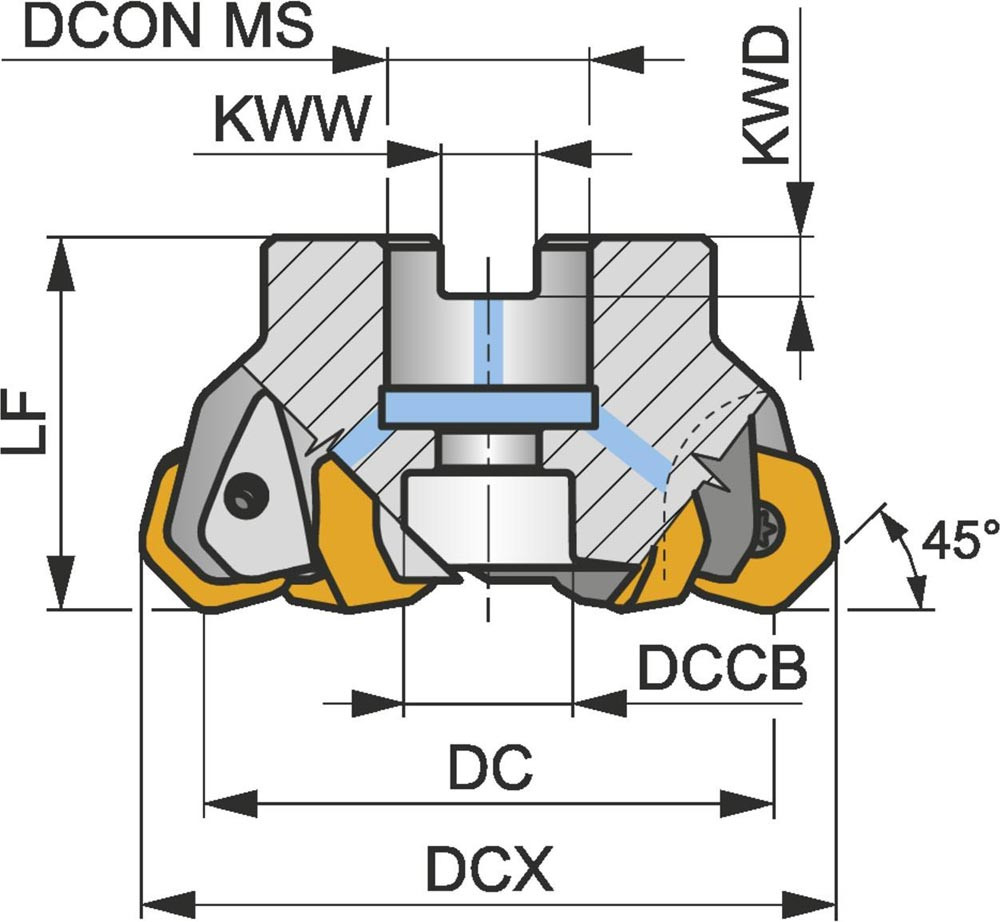 Planfräser mit doppelt negativer Geometrie zum spannen von 10 Stück HNGX 0906AN.. oder XNGX 0906AN.. doppelseitigen Wendeschneidplatten · Schnittdurchmesser 100 bis maximal 111.7mm mit 45° Anstellwinkel und 32mm Verbindungsbohrung gemäß DIN 8030-A · 50mm Überstandslänge · Kühlkanalbohrung zum Planfräsen · Rampen · progressiven Eintauchen und Entgratfräsen mit einer maximalen Schnitttiefe von 5.0mm