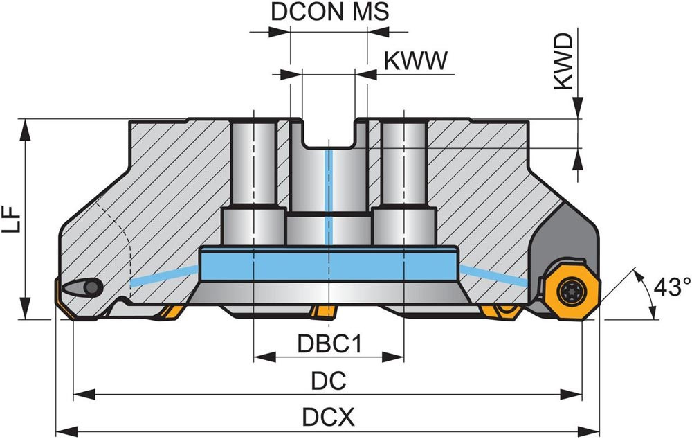 Planfräser mit doppelt negativer Geometrie welche 14 aus ONMX 0605.. · ONMX 0605..-W oder SNMX 1705.. doppelseitige Wendeschneidplatte · Schneiddurchmesser 160mm bis maximal 170,8mm mit 43° Anfahrwinkel und 40mm Bohrung gemäß DIN 8030-C · 63mm funktional und · durchgehende Kühlung zum Planfräsen und Entgratenmit einer maximalen Schnitttiefe von ON.. 4mm · SN.. 7mm