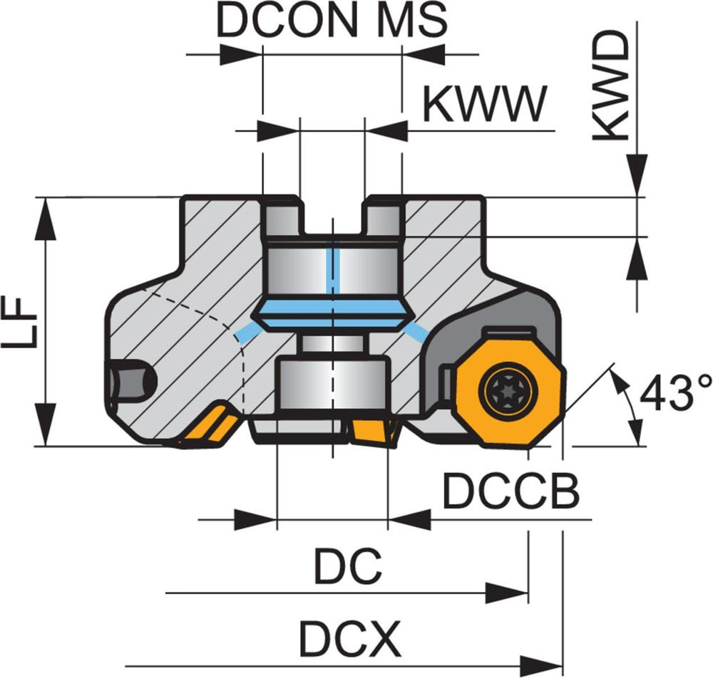 Planfräser mit doppelt negativer Geometrie welche 5 aus ONMX 0605.. · ONMX 0605..-W oder SNMX 1705.. doppelseitige Wendeschneidplatte · Schneiddurchmesser 63mm bis maximal 73,8mm mit 43° Anfahrwinkel und 22mm Bohrung gemäß DIN 8030-A · 40mm funktional und · durchgehende Kühlung und ungleicher Teilung zum Planfräsen und Entgratenmit einer maximalen Schnitttiefe von ON.. 4mm · SN.. 7mm