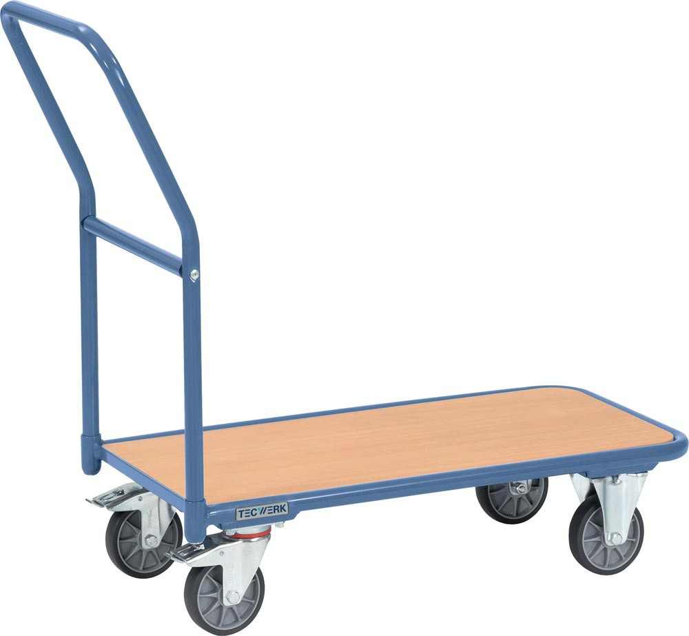 Stahlrohr und Profilstahl geschweißt, pulverbeschichtet taubenblau, RAL 5014 · anschraubbarer Schiebebügel · Ladefläche aus Holzwerkstoffplatten, Oberfläche Buchedekor · 2 Lenk- und 2 Bockrollen, Lenkrollen mit Feststeller · TPE-Bereifung · Naben mit Rillenkugellager · Zerlegte Anlieferung