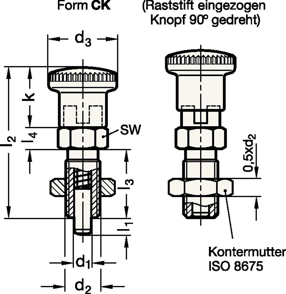 Rastbolzen GN 817 d1 8 mm d2 M16x1,5 mm l1 12 mm Stahl, ohne Rastsperre, mit Kontermutter