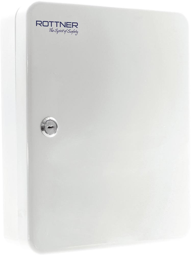Gehäuse und Tür aus Stahlblech · zur Aufbewahrung von 40 Schlüsseln · 8 glanzverzinkte Hakenleisten mit jeweils 5 Haken, im Rastersystem beliebig verstellbar, durchnummeriert, farbige Etiketten · Zylinderschloss mit 2 Schlüsseln · zur Wandmontage inkl. Befestigungsmaterial · 1 schwenkbare Zwischenwand · zur Wandmontage inkl. Befestigungsmaterial