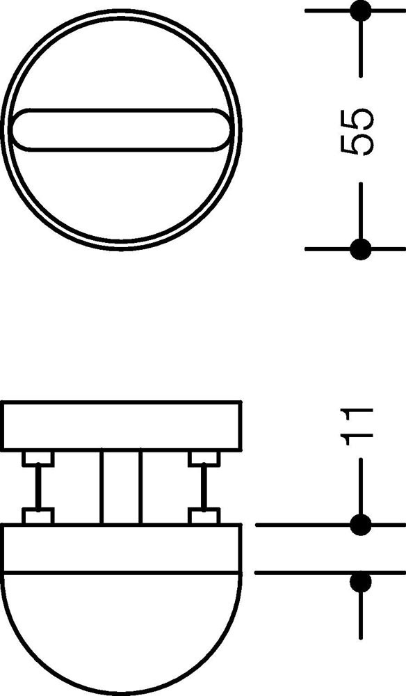 WC-Rosettenpaar · Polyamid durchgängig eingefärbt · Rosettenunterkonstruktion aus Kunststoff · DIN links und DIN rechts verwendbar · Verdeckte, lockerungssichere Verschraubung mit 5 mm Spaxschrauben und in das Türblatt eintauchenden Stützdehnzapfen · WC-Ausführung mit Schauscheibe (Anzeige rot/weiß) und Notöffnung mittels Münze (FBM) auf der Außenseite, Riegelolive auf der Innenseite · Rosetten-Abdeck-Kappe, rund, Durchmesser 55 mm, 10,5 mm hoch, 1,5 mm Wandstärke · für TS 38,1 - 48,0 mm · Edition matt