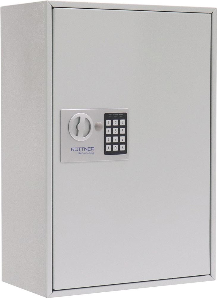 für 300 Schlüssel · batteriebetriebenes Elektronikschloss (ohne Batterien) · mechanische Notöffnung durch Schlüssel möglich, zweifach · verstellbare Haken, schwenkbares Register · 300 Schlüsselanhänger gratis