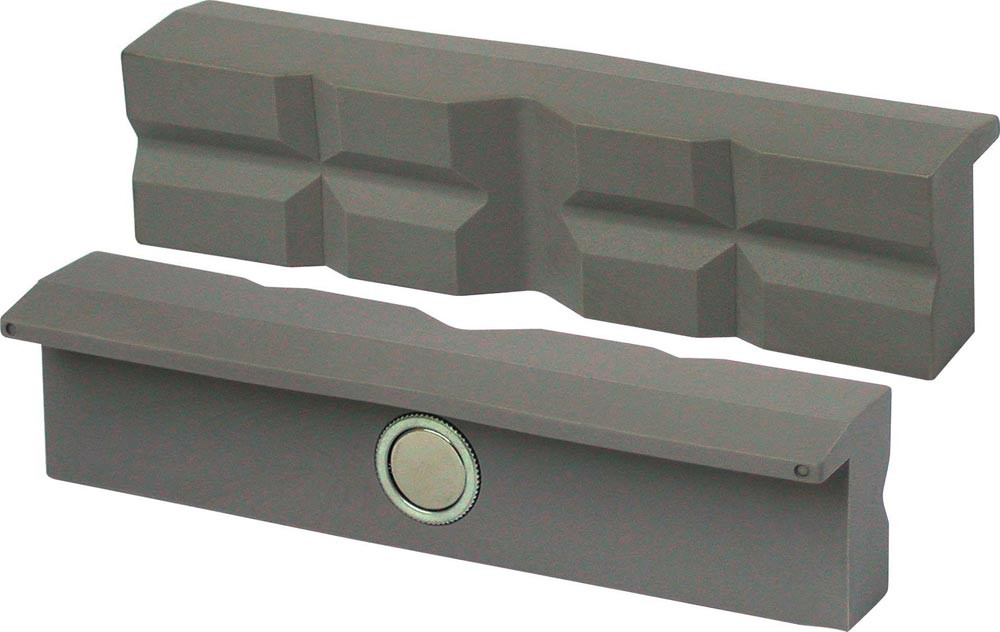 aus Polyurethan · zum Spannen von empfindlichen Werkstücken · mit äußerst kräftigem Neodym Flachmagnet, welcher fest in der Backe verpresst ist und sich auch nach langer Benutzung nicht löst · der Magnetismus dringt nicht zu der vorderen Spannfläche vor · passend für alle Schraubstocktypen · Besondere Produktvorteile: