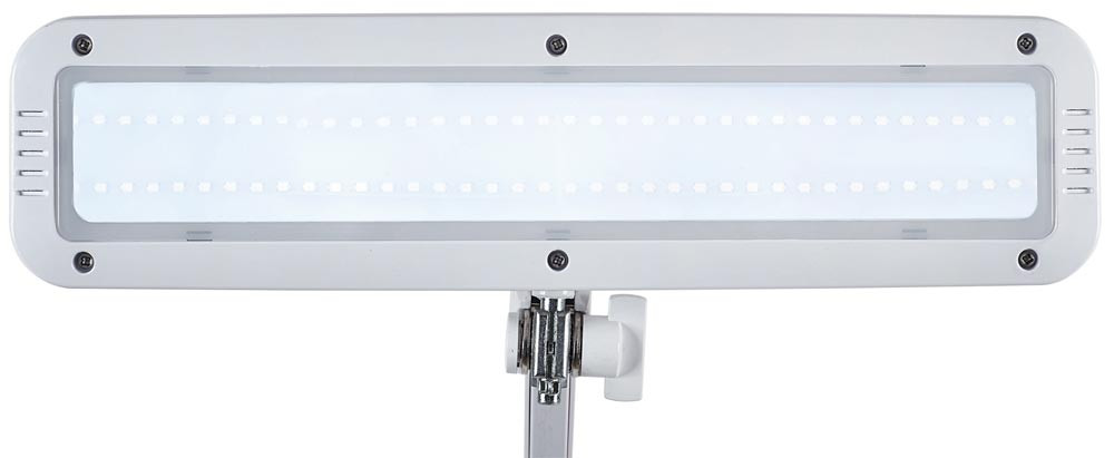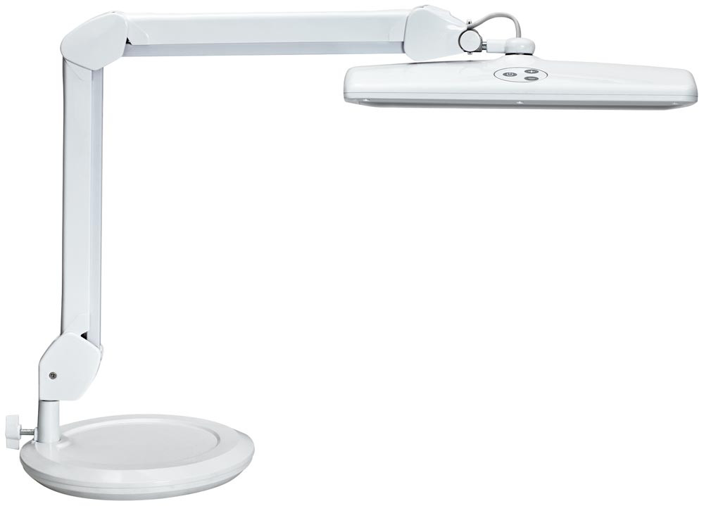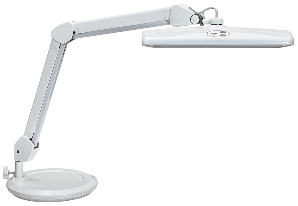 ∙ Leistungsstarke, kompakte LED-Leuchte, stufenlos dimmbar ∙Robuster Metallarm ∙ Difusor für geringen Schattenwurf ∙ 6500 Kelvin (tageslichtweiß) ∙ 2920 Lux bei 35 cm Abstand ∙ Nutzlichtstrom je Lichtquelle 1449 Lumen ∙ Eine Lichtquelle ∙ Schalter am Leuchtenkopf für bequemes Ein- und Ausschalten