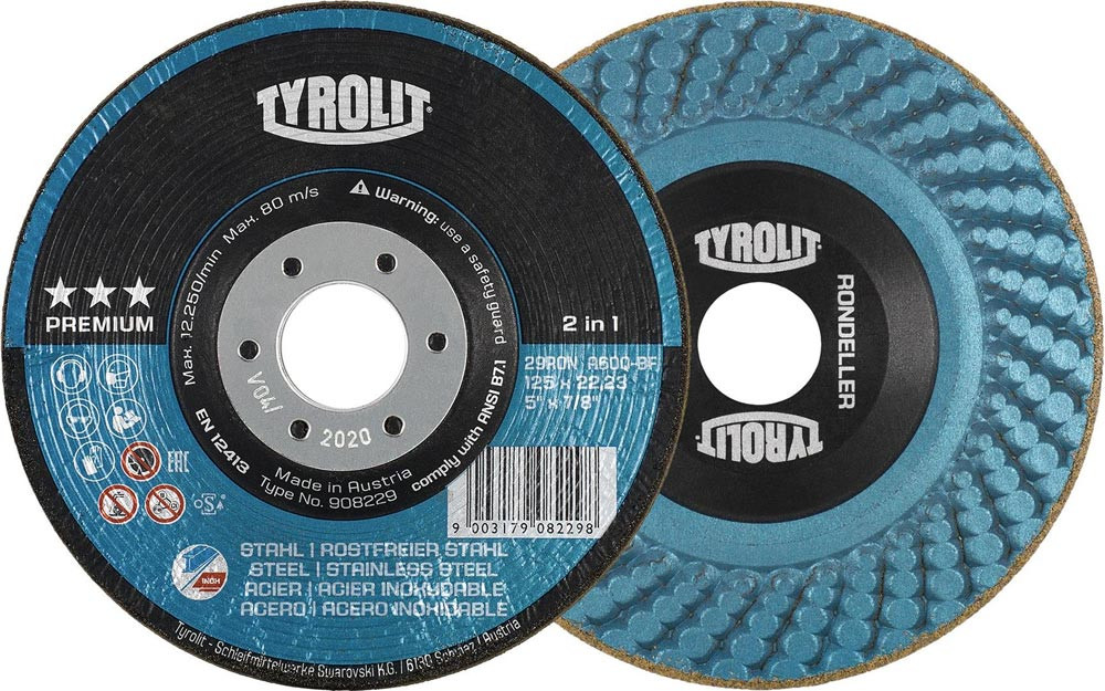 Premium-RONDELLER® vereint Produktvorteile verschiedener Schleifwerkzeuge · durch die einzigartie Geometrie ist es möglich, kühl, werkstoffschonend und ergonomisch zu arbeiten · vibrationsfreies Arbeiten und optimale Anpassung an das Werkstück bei sämtlichen Schleif-, Entgratungs und Formgebungsanwendungen ermöglichen es, gekrümmte Flächen perfekt zu bearbeiten · einfache Montage ohne die Verwendung von Spezialzubehör wie Stützteller und Spannmutter · Bohrung 22,23 mm Ø