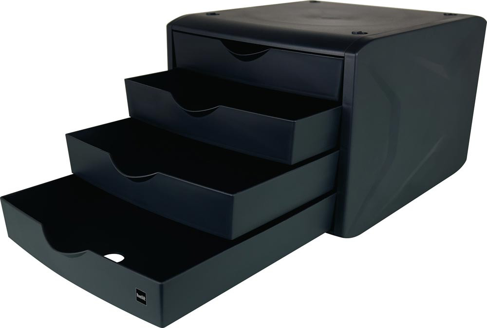 recycelter Kunststoff · stapelbar · 4 Schubladen für DIN A4 Formate · mit Auszugssperre · H 215 x B 265 x T 332 mm