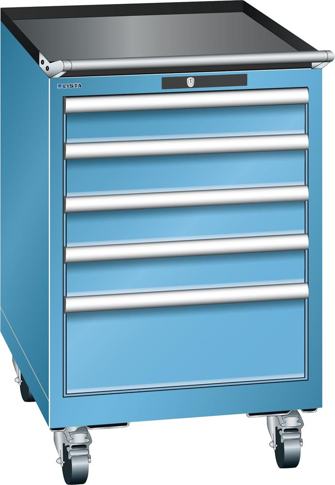Schubladenschrank, Traglast/Schubl.: 75 kg, fahrbar, 5 Schubladen: 4x100, 200 mm, Zylinderschloss, BxTxH 564x572x890 mm, RAL 5012 E876440