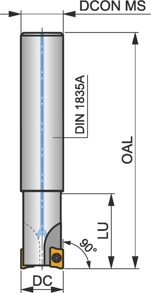 Eckfräser mit positiver/negativer Geometrie zum spannen von 2 Stück ADMX 0702.. oder ADEX 0702.. einseitigen Wendeschneidplatten · Schnittdurchmesser 10mm mit 90° Anstellwinkel und 10mm Zylinderschaft gemäß DIN 1835A · 16mm Funktionslänge 80mm Gesamtlänge · Kühlkanalbohrung zum flachen Schulterfräsen · flachen Nutfräsen · Rampen · Helikalen Fräsen · Tauchfräsen und progressiven Eintauchen mit einer maximalen Schnitttiefe von 5.0mm