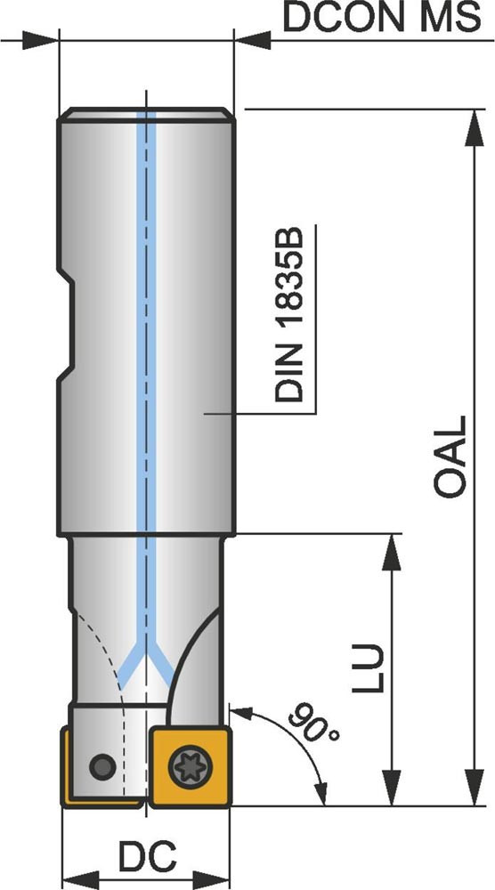 Eckfräser mit positiver/negativer Geometrie zum spannen von 4 Stück SOMT 09T3.. einseitigen Wendeschneidplatten · Schnittdurchmesser 32mm mit 90° Anstellwinkel und 32mm Weldon Schaft gemäß DIN 1835B · 102mm Gesamtlänge · Kühlkanalbohrung und ungleiche Teilung zum flachen Schulterfräsen · flachen Nutfräsen und Tauchfräsen mit einer maximalen Schnitttiefe von 8.0mm