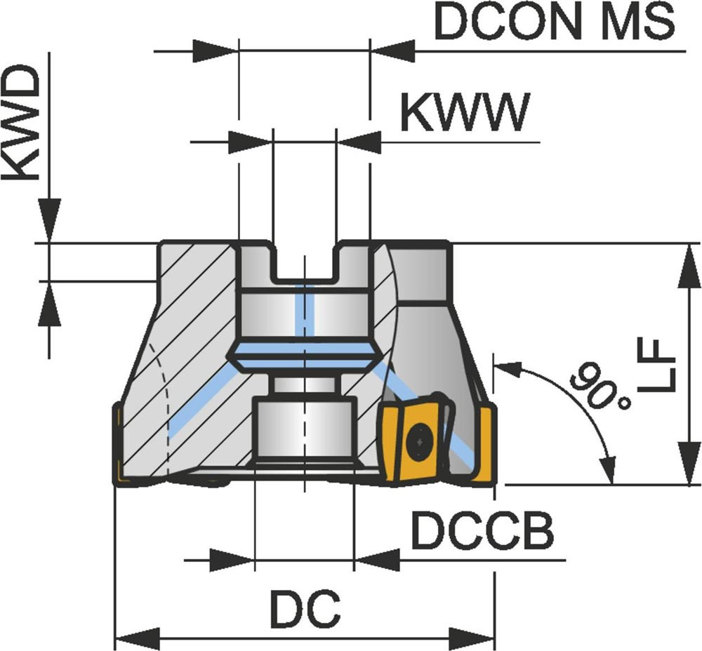 Eckfräser mit doppelt negativer Geometrie welche 3 aus LNEX 1210.. doppelseitige Wendeschneidplatte · Schneiddurchmesser 40mm mit 90° Anfahrwinkel und 16mm Bohrung gemäß DIN 8030-A · 40mm funktional und · durchgehende Kühlung zum Planfräsen · flachen Schulterfräsen · tiefen Schulterfräsen · Tauchfräsen und flachen Nutfräsen mit einer maximalen Schnitttiefe von 10mm