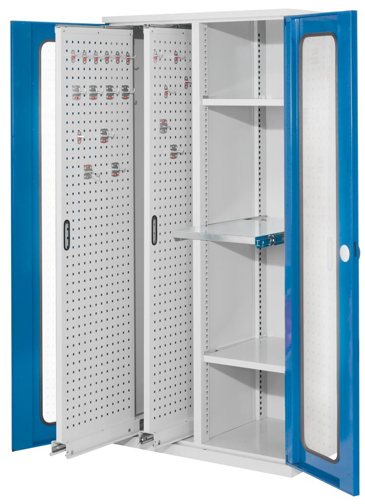 Schwerlastschrank, Sichtfenstertüren, 2 Vertikalauszüge, 2 Fachböden, 1 Auszugsb. BxTxH 1000x600x1950 mm, RAL 7035 / RAL 5010