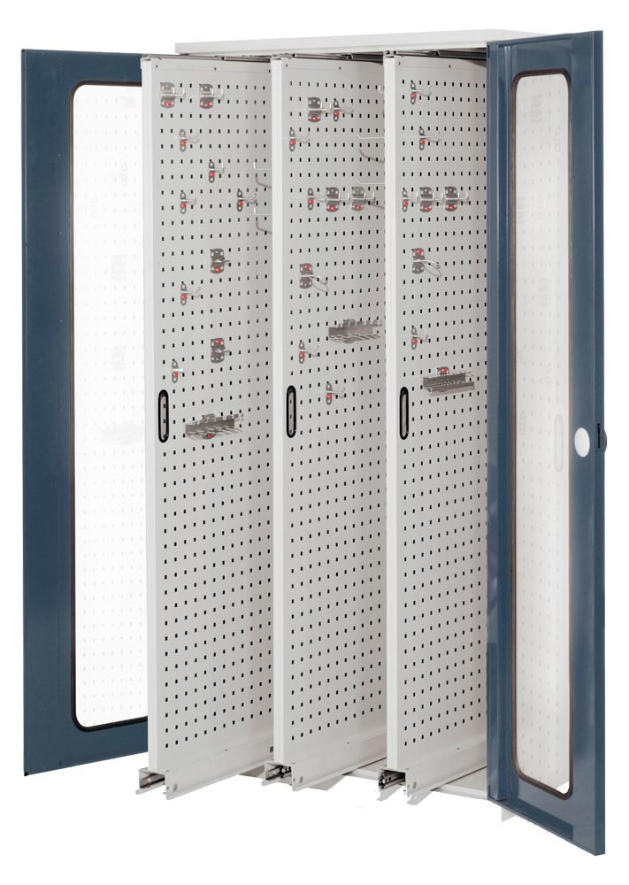 Schwerlastschrank, Sichtfenstertüren, 3 Vertikalauszüge, BxTxH 1000x600x1950 mm, RAL 7035 / RAL 7016