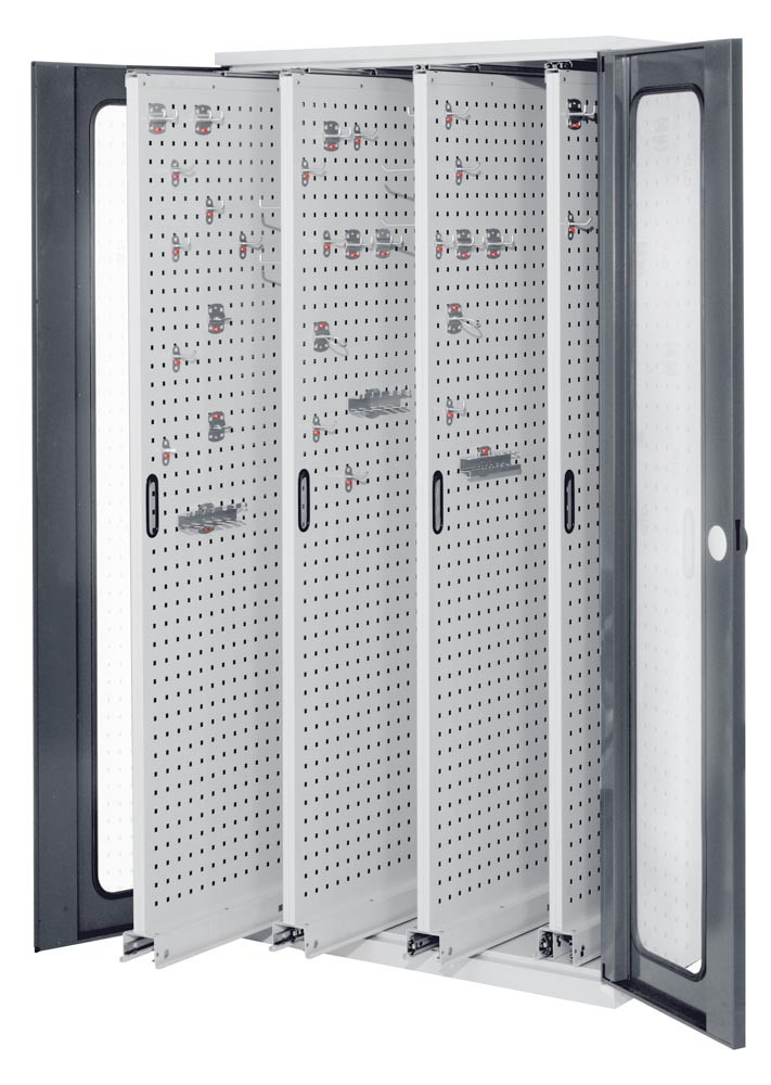 Schwerlastschrank, Sichtfenstertüren, 4 Vertikalauszüge, BxTxH 1000x600x1950 mm, RAL 7035/7016