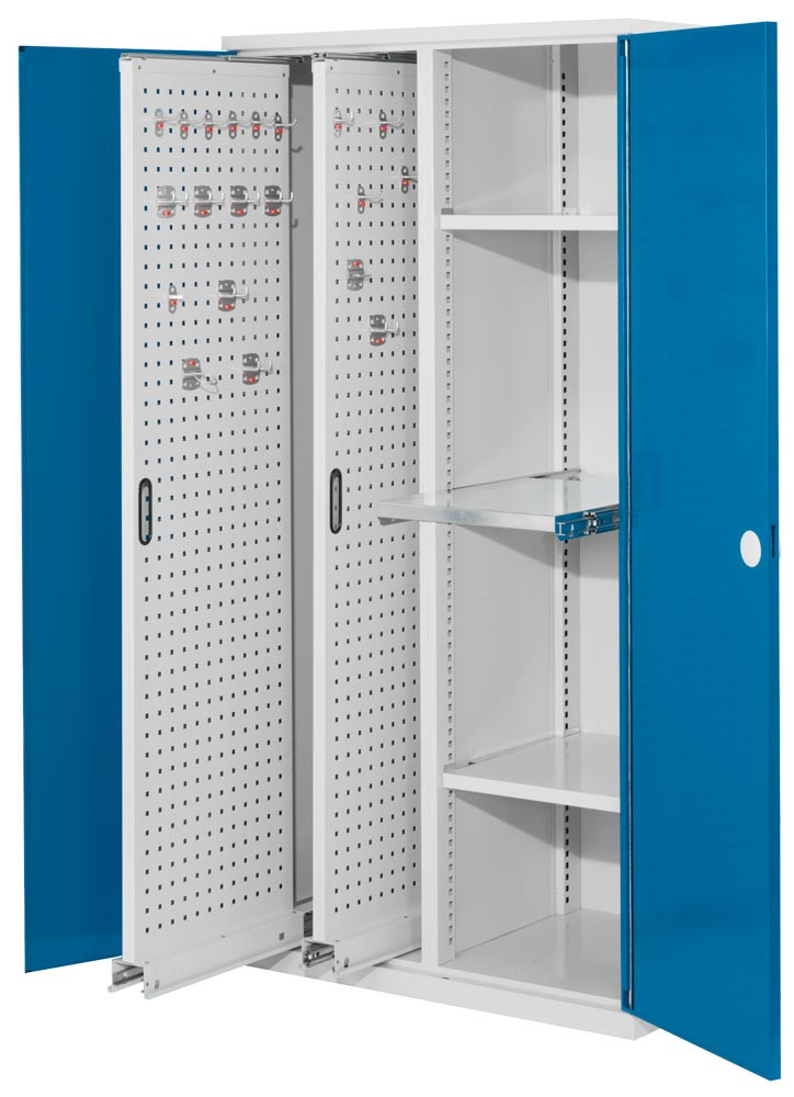 Schwerlastschrank, Vollblechtüren, 2 Vertikalauszüge, 2 Fachböden, 1 Auszugsb. BxTxH 1000x600x1950 mm, RAL 7035 / RAL 5010
