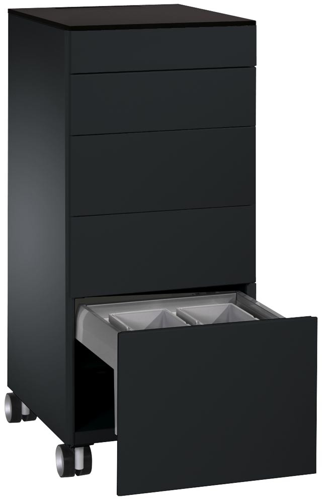 · Stahlkorpus doppelwandig, körperschallgedämpft für angenehmes Geräuschverhalten · HPL-Abdeckplatte · Kabelklappe in der Abdeckplatte mit 2 Steckdosen (230 V) und 3 m Zuleitung · Schubladen mit voll ausziehbaren Präzisionsschienen, End-Selbsteinzug und Soft-Stopp für sanfte Schließung · Variable Inneneinrichtung für die Schubladen · 4 Maxi-Lenkrollen, 2 davon feststellbar