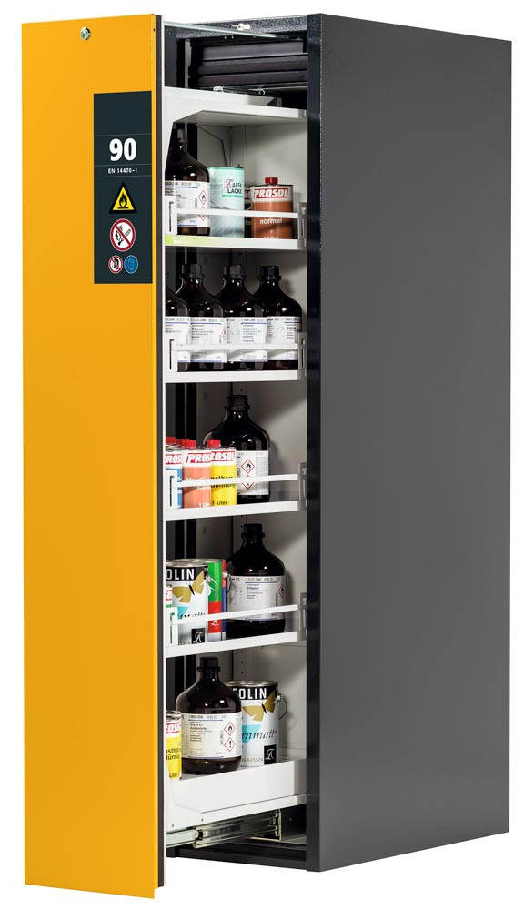 Sicherheitsschrank mit Vertikalauszug, Typ 90, BxTxH 450x860x1966 mm, 4xFachboden, 1xLochblecheinsatz, 1 Bodenwanne, RAL 7016/1004 E6020905