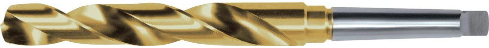 HSS-Co5 TiN-beschichtet · DIN 345 · Typ N · Spitzenwinkel 118 ° · rechtsschneidend · Kegelmantelanschliff · Querschneide nach DIN 1412 A · leistungsstarker Standardbohrer aus kobaltlegiertem HSS mit höherer Warmhärtebeständigkeit · ideal zum Bohren von schwer zerspanbaren Werkstoffen und für höchste Beanspruchung · mit Titan-Nitrid-Beschichtung · durch die TiN-Beschichtung erhöht sich die Oberflächenhärte aus ca. 2300 HV und die Warmhärtebeständigkeit bis auf 600 °C · ideal zum Bohren von schwer zerspanbaren Werkstoffen und für höchste Beanspruchung · Einsatzgebiete: für Stahl und Stahlguss legiert und unlegiert (bis 1200 N/mm² Festigkeit), Grauguss, Temperguss, hochchromlegierte Stähle wie V2A und V4A, rost- und säurebeständige Stähle · Leistungsstarker Standardbohrer mit Morsekegel · hohe Bruchsicherheit