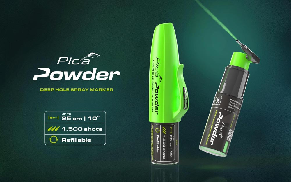 für tiefe Bohrlöcher für Ø 3 -12 mm · präzise Punktmarkierung, bis zu 25 cm Tiefe · hinterlässt mit einem Sprühstoß gut sichtbare, grün-fluoreszierende Markierungen · manuelles Pumpsystem ZERO GAS · garantiert Langlebigkeit mit bis zu 1.500 Schuss ohne Nachfüllung · 360° schwenkbarer Sprüharm für flexible Anwendung – auch in extrem schwer zugänglichen Bereichen · inklusive Köcher für die Befestigung an der Hosentasche · von glatten Oberflächen leicht entfernbar · perfekt geeignet für unterschiedliche Gewerke: von Zimmerei bis Elektro-, Sanitär-, Bau- und Heimwerkerprojekte