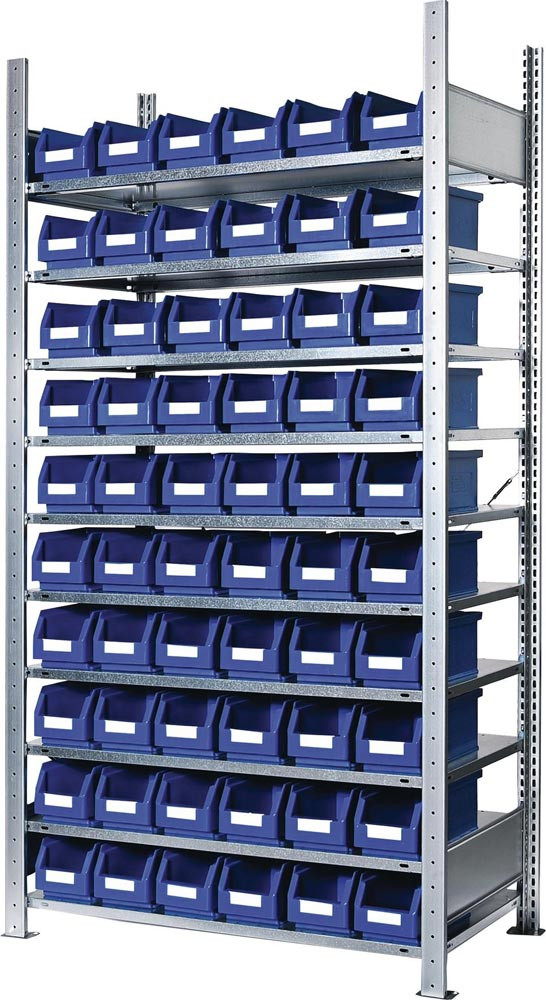 komplett mit Sichtlagerkästen Raster-Plan°· einfache und schnelle Steckmontage mit vormontierten verzinkten Rahmen · Fachböden verzinkt mit verstärktem Kastenprofil, H 25 mm, höhenverstellbar im 25-mm-Raster · Tragfähigkeit pro Fachboden 150 kg · Feldlast 1300 kg