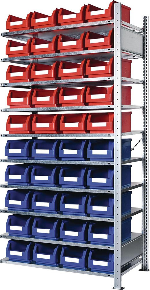 Steckregal H2000xB1000xT400mm Anbauregal 10 Stahlböden 20 x Gr. 4 blau, 20 x Gr. 4 rot