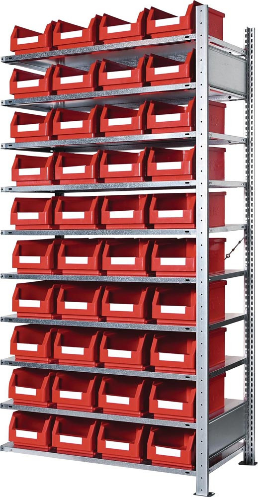 komplett mit Sichtlagerkästen Raster-Plan°· einfache und schnelle Steckmontage mit vormontierten verzinkten Rahmen · Fachböden verzinkt mit verstärktem Kastenprofil, H 25 mm, höhenverstellbar im 25-mm-Raster · Tragfähigkeit pro Fachboden 150 kg · Feldlast 1300 kg